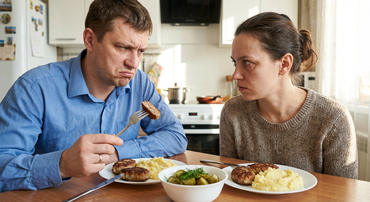 – Ну вот опять, Нина, ты пересушила котлеты. Я же сколько раз тебе говорил: мама всегда добавляет в фарш вымоченный в молоке белый хлеб, причем не просто мякиш, а именно корочку, для аромата. А у тебя что? Сплошное мясо, жесткое, как подошва. Жуешь, и челюсть сводит.