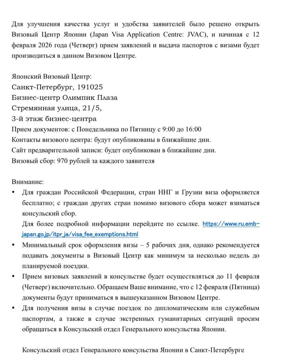 🇯🇵 Питер, хорошие новости: за японской визой в Москву ехать не придётся. Визовый центр с 12 февраля открывается и у вас. Это ТЦ Olympic Plaza на Марата 5 — да, тот самый, где айфоны продают. Генконсульство указывает улицу Стремянная, но это про то же место. Приём документов с понедельника по пятницу с 9:00 до 16:00. Визовый сбор — 970 ₽.