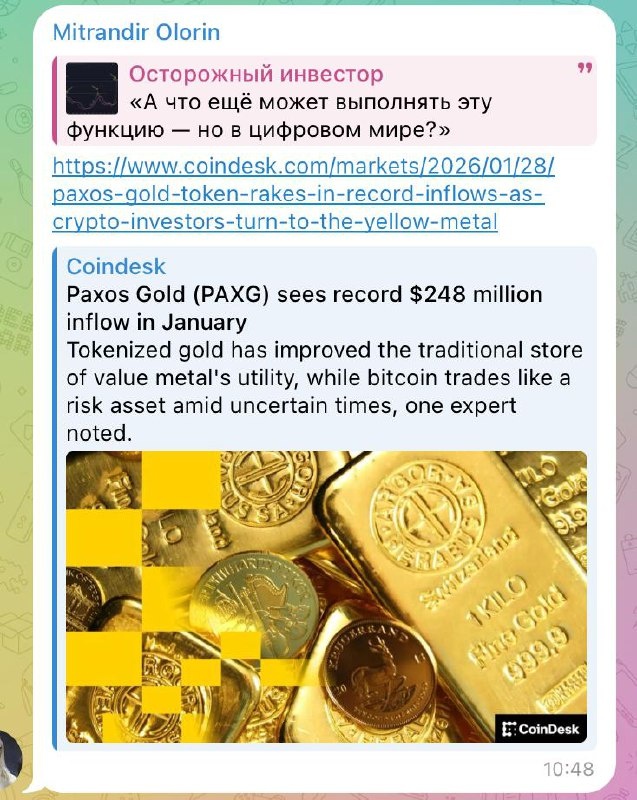 В последнее время всё чаще звучит намёк: «А что если токенизированное золото — это и есть ответ цифрового мира? Зачем тогда биткойн?» Формально аргументы выглядят логично. PAXG, XAUT и подобные инструменты показывают приток капитала. Цифровая форма. Золото в основе. Удобство, ликвидность, DeFi. Но здесь происходит подмена понятий. Токенизированное золото — это не новые деньги. Это старые деньги в новой упаковке. По своей природе токенизированное золото — это: • право требования • эмитент • кастодиан • юрисдикция • регулятор • возможность заморозки • возможность изменения правил Неважно, где физически лежит золото. Токен — это не металл. Это доверие к цепочке посредников. Теперь сравним это с биткойном. Биткойн не требует доверия. • У него нет эмитента. • Нет кастодиана. • Нет точки контроля. • Нет «улучшений по решению совета директоров». Это не улучшенная версия золота. Это другая категория актива. Почему тогда сейчас усиливается нарратив про токенизированное золото? Потому
