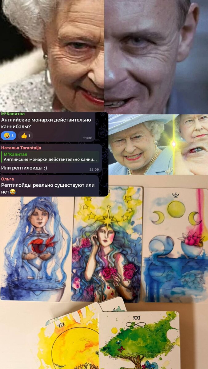 )) По пажу кубков, Рептилоиды (также люди-рептилии, драконианцы, люди-ящеры, сауряне) — вымышленные разумные человекоподобные рептилии, чаще всего изображаемые как существа внеземного происхождения и способные принимать облик человека. существуют, но далеко от нас, плюс карта какая-то безобидная, так что нет зверя на планете страшнее, чем человек. Что касается англичан и их королей/королев, то рептилоидов среди них нет (Звезда), а вот каннибализмом в прошлом они и впрямь занимались (солнце, мир). Но было это давно, не в наших веках, уж померли все, кто это делал. А потомки их очень разочарованы таким наследием (4 кубков).