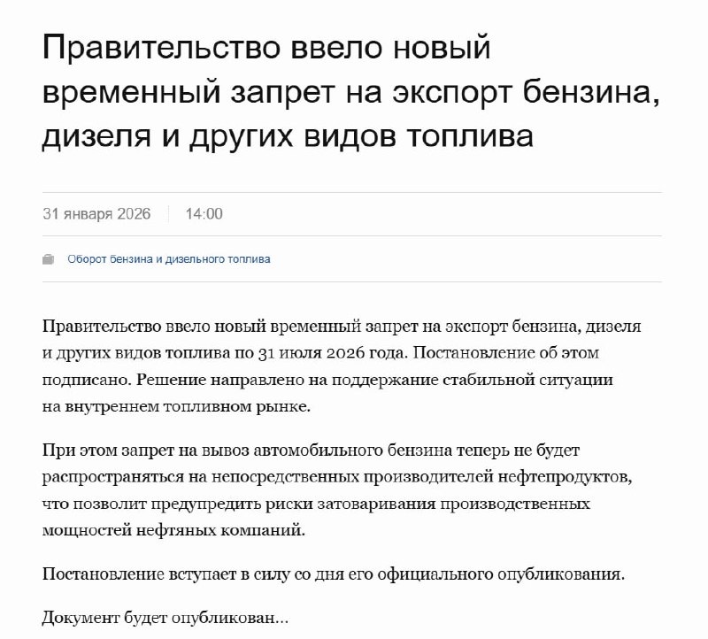 Постановление пока не опубликовано, об изменениях сообщает пресс-служба правительства. В публикации разрешение на поставки на внешние рынки для нефтяных компаний мотивируется потенциальным затовариванием мощностей. Для непроизводителей запрет на экспорт нефтепродуктов продлен до конца июля. Причём, скорее всего, его будут продлевать и дальше из-за сезонного высокого спроса. Оптовые цены на товарной бирже пошли вверх уже на фоне слухов о возобновлении экспорта, в понедельник, вероятно, рост продолжится.