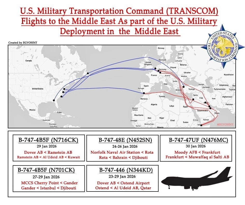 Как минимум пять Boeing 747 Транспортного командования США (USTRANSCOM) осуществили перелет из США в Европу и затем на Ближний Восток в рамках наращивания американской военной мощи в регионе. Самолеты осуществляли перелеты с баз ВВС, КМП и ВМС США. #Иран Военный Осведомитель
