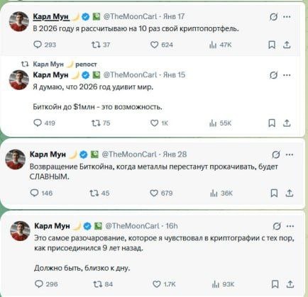 : Годами наш герой орал что доллар это грязная бумажка, ФРС вот-вот накроется медным тазом, инфляция сожрет всех, спасет только крипта. "Золото старое и неудобное, будущее за цифровым золотом!" И вот ирония, бакс реально начал сдавать. Только ликвидность побежала не в крипту, а в золото, фунт, евро. Золото выросло на 130%. Наш криптан в это время сидит в своих "фундаментальных альтах" в минусе на 90%. "Ничего страшного, это временно! Мои проекты фундаментальные, просто еще не все поняли! Ликвидность сначала идет в старые безопасные активы, а потом обязательно перетечет в мои альты!" Золото продолжает расти. Альты продолжают падать. Криптан продолжает оправдываться: " Ну всё понятно — когда золото откатит от этих хаев, деньги обязательно придут в мои фундаментальные альты! Логично же!" Вчера золото с серебром скорректировались нбольше чем на 10% — $5 ТРИЛЛИОНА вышло из металлов. $5трлн, это вся капитализация крипты. И что мы видим: его фундаментальные альты упали на те же 10%. Но не