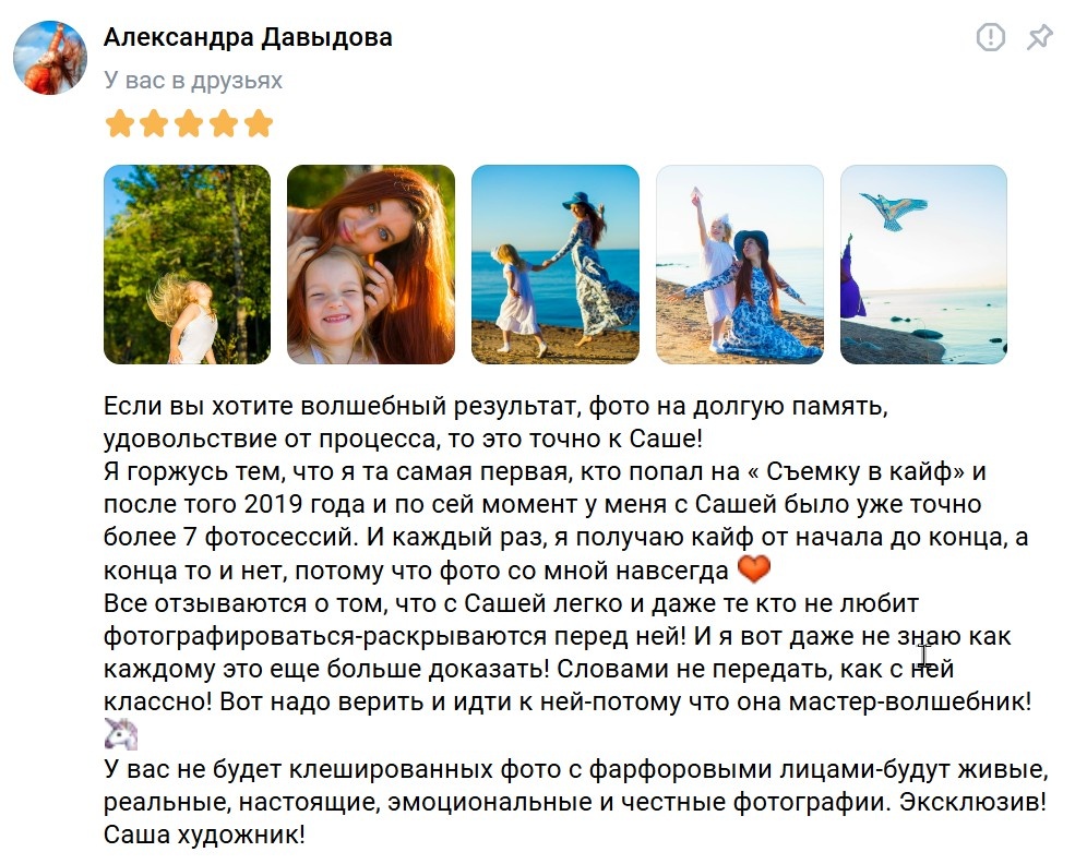 Для меня как фотографа очень важны отзывы клиентов. Они помогают понять - мои творения радуют и наполняют положительными эмоциями. Каждая съемка — подтверждение того, что я двигаюсь в правильном направлении и создаю то, что нужно людям. Особенно ценно для меня услышать о том, какие чувства и эмоции клиенты испытывают после съёмки. Это вдохновляет на новые свершения и помогает расти профессионально. С теплотой делюсь отзывом Александры, которая стала для меня другом с первой съемки, а с каждой новой - наша теплота только увеличивается. Отзыв Александры: “Если вы хотите волшебный результат, фото на долгую память, удовольствие от процесса, то это точно к Саше! Я горжусь тем, что я та самая первая, кто попал на « Съемку в кайф» и после того 2019 года и по сей момент у меня с Сашей было уже точно более 7 фотосессий. И каждый раз, я получаю кайф от начала до конца, а конца то и нет, потому что фото со мной навсегда. Все отзываются о том, что с Сашей легко и даже те кто не любит фотографиров