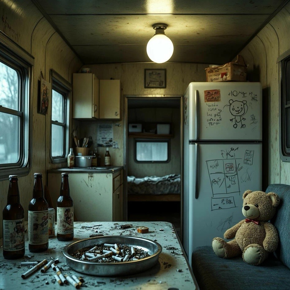 Она нерешительно отходит от двери, пропуская Марка внутрь. Он крупным планом выхватывает детали убогой обстановки: полную пепельницу окурков, грязную посуду, сломанные игрушки в углу.