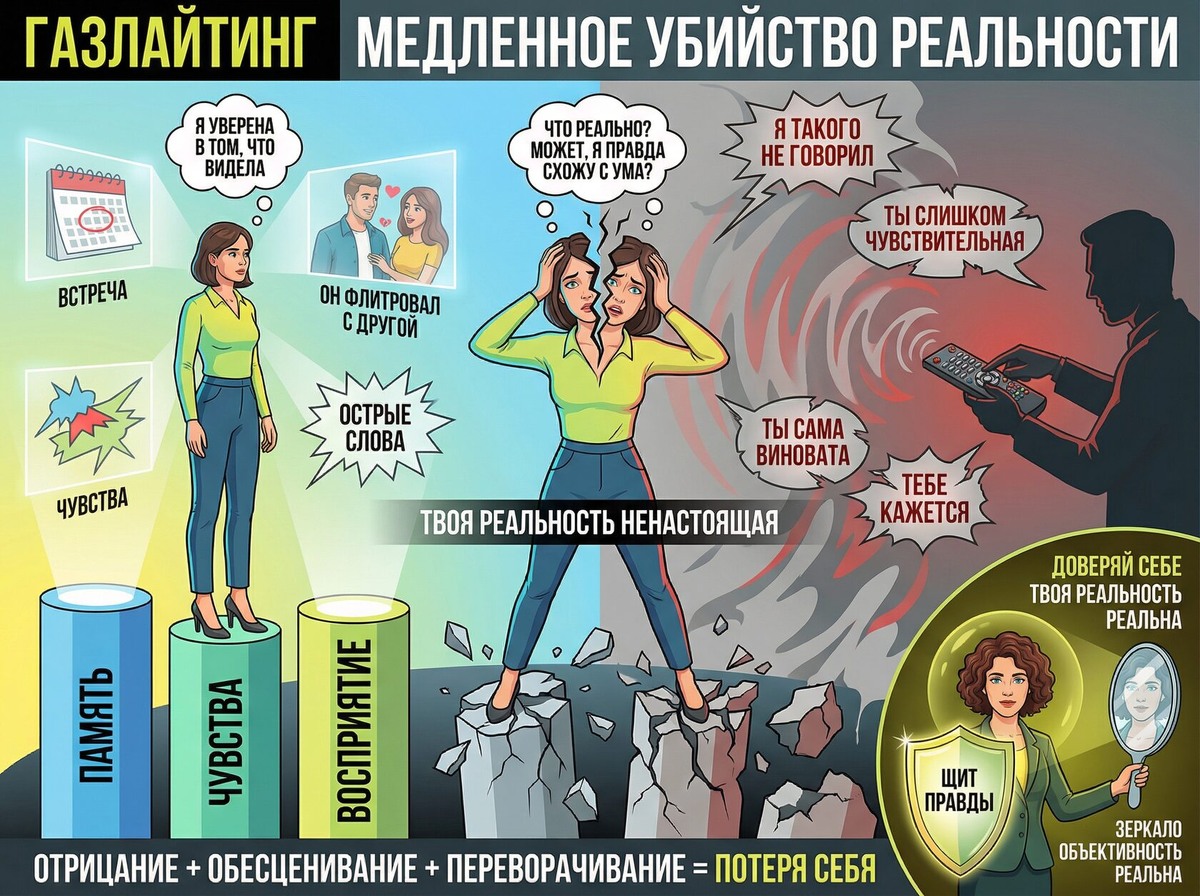 Вы видели переписку с другой женщиной. Он смеётся: «Ты неправильно поняла. Это коллега. Ты всё выдумала». Вы знаете, что видели. Но он так уверенно отрицает, что начинаете сомневаться: «Может, я правда неправильно поняла?»