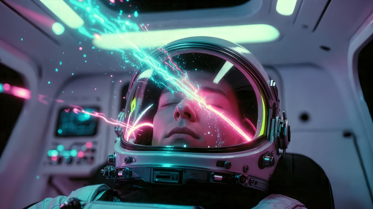 Представьте: полная, абсолютная темнота. Вы лежите в спальном мешке на борту МКС. Ваши глаза закрыты. Над лицом — толстый слой пластика и металла гермошлема. Никакого света. И вдруг — вспышка! 🔦