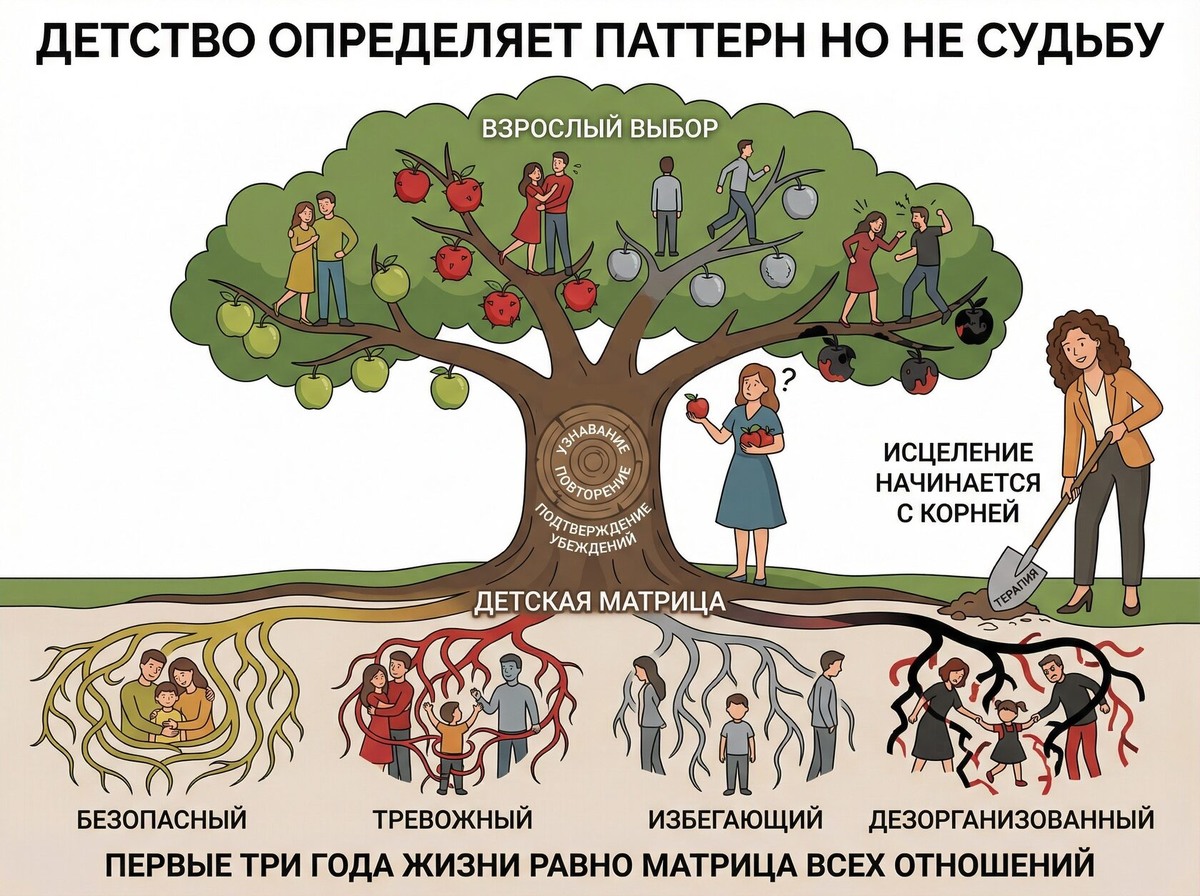 Да, детство определяет паттерн. Но не определяет судьбу. Травму привязанности можно исцелить. Паттерн — изменить. Бессознательное — переписать.