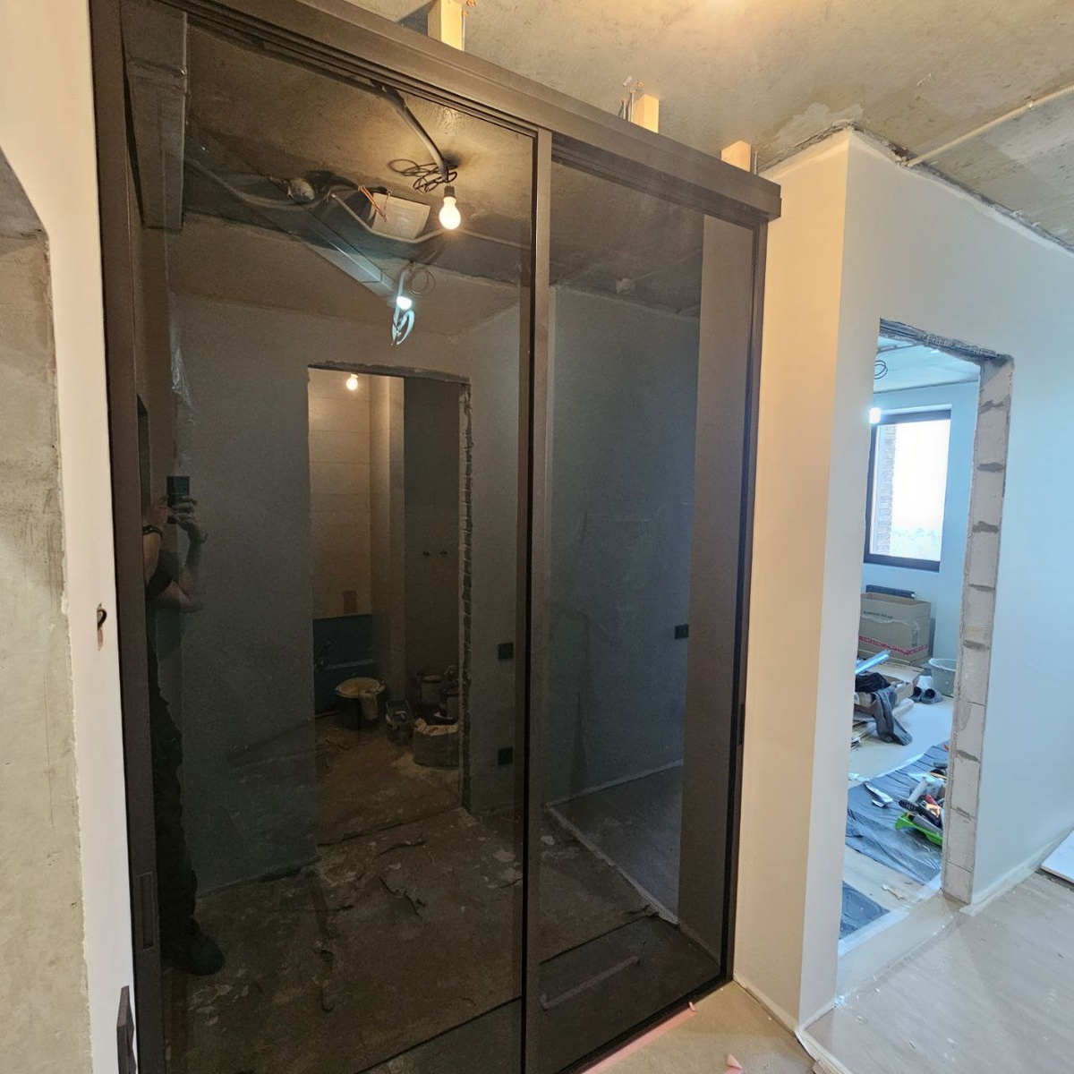 !🌈 Сегодня работали не только над перегородкой,но и над закладной для крепления натяжного потолка.🧩 Мы всегда в связке с мастерами по потолкам, наше взаимодействие крайне важно для успешного соединения наших изделий с потолком. В сториз покажем более детально закладную👌 И,конечно, Вы в восторге от черного закаленного стекла толщиной 6 мм😋 #раздвижнаяперегородка #перегородканазаказ #межкомнатнаяперегородка #дверигардеробной #перегородкиизстекла #простормебель #лучшиевделе