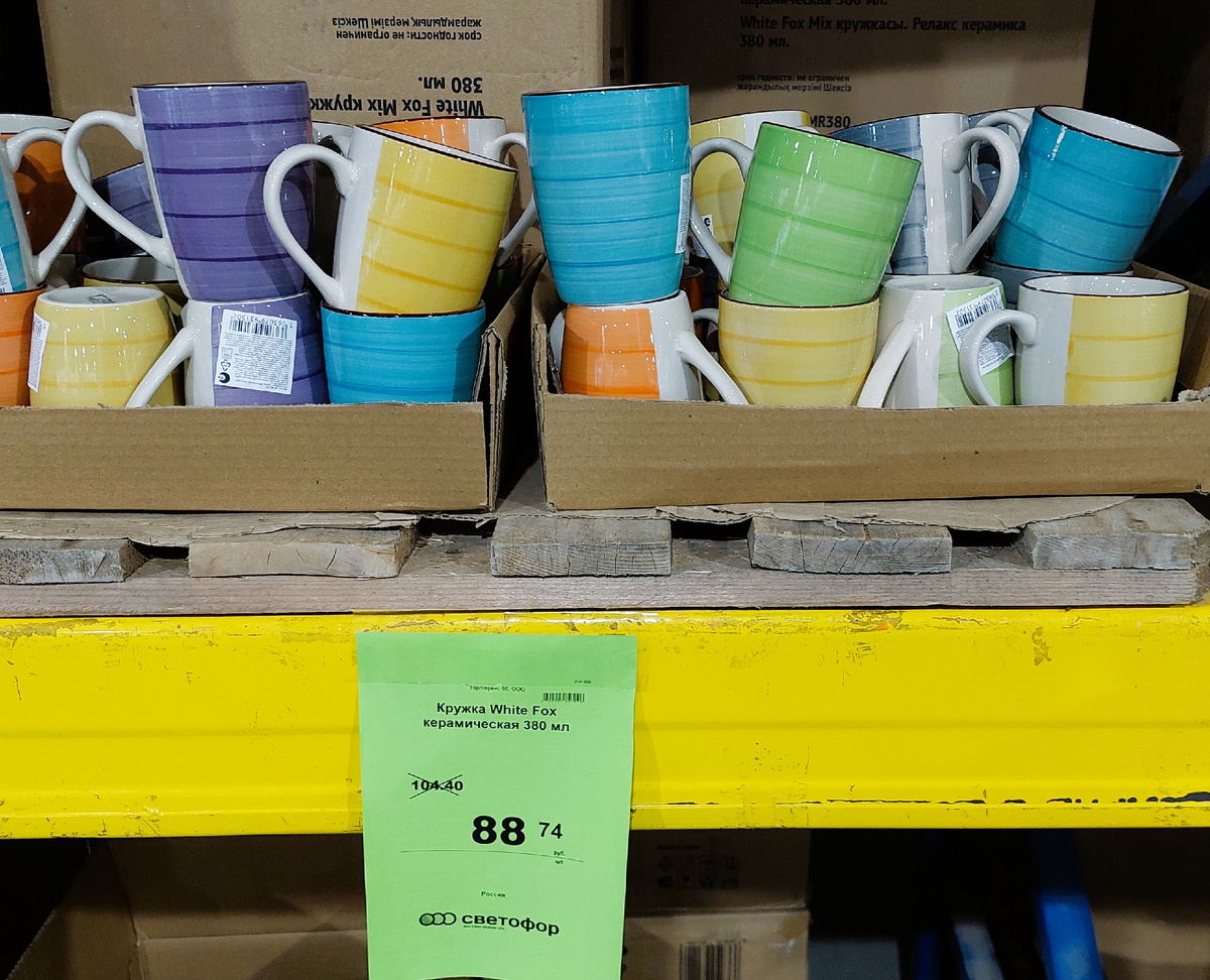 В выходной день с утра наблюдали вот такую картину в Светофоре. Приятно удивились такому враз большому числу товаров со скидками. И особенно постарался посудный отдел.