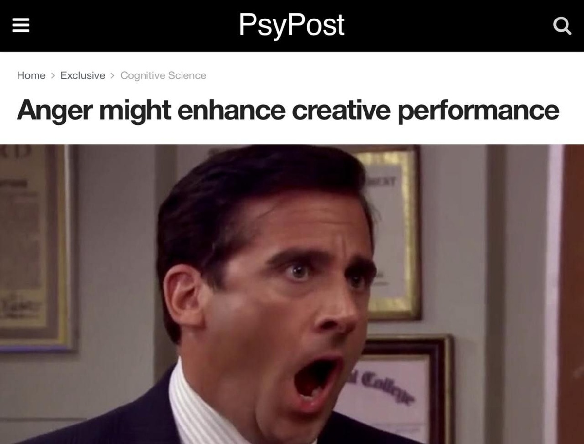 Мы привыкли считать злость чем-то однозначно вредным. Но психология эмоций говорит: всё не так просто. Умеренный гнев действительно способен временно повысить продуктивность и креативность. ⚙️ Что происходит в организме Злость активирует симпатическую нервную систему — ту самую реакцию «бей или беги». Учащается пульс, повышается уровень адреналина, мозг переходит в режим мобилизации. Это может: 🧠 усиливать концентрацию ⚡️ ускорять принятие решений 🎯 повышать настойчивость в достижении цели В задачах, где нужна энергия, напор и преодоление препятствий, такое состояние иногда реально помогает. 💡 Почему это может усиливать креативность Гнев связан с мотивацией «приближения» — человек стремится что-то изменить, исправить ситуацию, убрать препятствие. Это подталкивает искать новые решения, а не пассивно мириться с проблемой. ❗️Но есть важный нюанс Это работает только при контролируемой и кратковременной эмоции. Хроническая злость делает обратное: • ухудшает память и гибкость мышления
