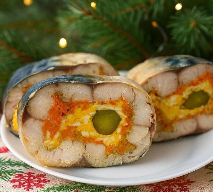 ИНГРЕДИЕНТЫ: ✅ Скумбрия (свежемороженая) — 2 шт ✅ Растительное масло — 50 мл ✅ Лук — 1 шт ✅ Морковь — 1 шт ✅ Яйца (отварные) — 2 шт ✅ Огурцы маринованные — 2–3 шт (небольшие) ✅ Желатин — 10–15 г ✅ Соль, чёрный перец — по вкусу ✅ Чеснок (свежий или сухой) — по вкусу ПРИГОТОВЛЕНИЕ: 1. На сковороду налить растительное масло. Лук нарезать кубиками и пассеровать до прозрачности. Добавить тёртую морковь, слегка посолить и готовить до полуготовности. Переложить в тарелку и остудить до тёплого состояния. 2. Скумбрию разморозить (лучше один раз, без повторной заморозки). Отрезать головы и хвосты, удалить плавники. Разрезать брюшко, убрать внутренности и чёрную плёнку, промыть. 3. Разделать рыбу на «пласт»: сделать надрез вдоль хребта, отделить филе от костей с двух сторон, аккуратно вырезать хребет. Удалить крупные косточки по краям и в середине (пальцами/пинцетом). Так же подготовить вторую рыбу. 4. На стол расстелить пищевую плёнку. Выложить две скумбрии рядом, слегка внахлёст (0,5–1 см)