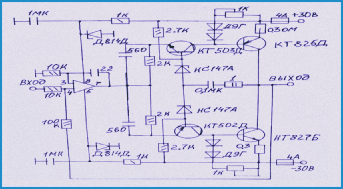 Выходной каскад реализован на транзисторах КТ825 и КТ827, которые выполняют ключевую функцию: