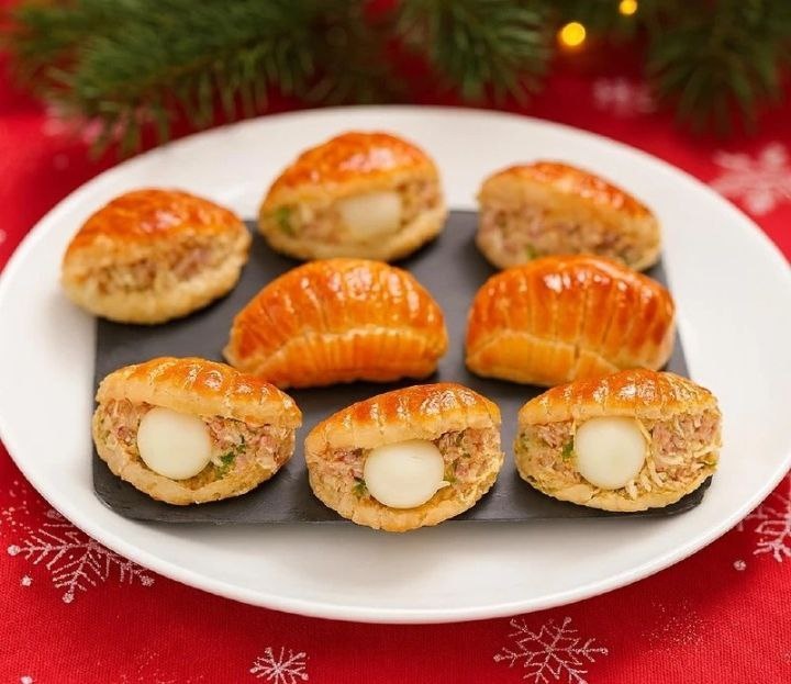 ИНГРЕДИЕНТЫ: Основa: ✅ Слоёное бездрожжевое тесто — 250 г ✅ Перепелиные яйца — 9 шт. Начинка: ✅ Печень трески — 100 г ✅ Яйца куриные — 3 шт. ✅ Маринованный огурец — 60 г ✅ Лук — 1/4 шт. ✅ Петрушка — несколько веточек ✅ Соль — по вкусу Для смазывания ракушек: ✅ Желток — 1 шт. ✅ Молоко — 1 ч. л. ПРИГОТОВЛЕНИЕ: 1. Раскатать слоёное тесто и вырезать 9–18 кружочков (в зависимости от размера). 2. На каждом кружочке сделать неглубокое углубление ножом — это поможет подняться краям и образовать форму «ракушки». 3. Смешать желток с молоком и смазать заготовки. 4. Разогреть духовку до 200°C и выпекать 15 минут до румяной корочки. 5. Обрезки теста не выбрасывать: обмакнуть в смесь желтка с молоком, затем в сахар с корицей и выпечь 8 минут — получится быстрый сладкий десерт. 6. Для начинки: печень трески размять вилкой. 7. Отваренные яйца мелко нарезать. 8. Огурец и лук также нарезать очень мелко. 9. Петрушку измельчить. 10. Смешать все ингредиенты, при желании добавить немного майонеза, посол