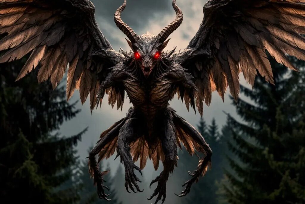За его спиной виднелась пара огромных крыльев. Они были темными, почти черными, и медленно, почти лениво двигались вверх и вниз, словно существо просто разминалось или, что еще хуже, оценивало нас. Мы стояли примерно в пятидесяти-шестидесяти шагах, но даже на таком расстоянии я могла ясно видеть его очертания, его движения, его жуткие, немигающие глаза.