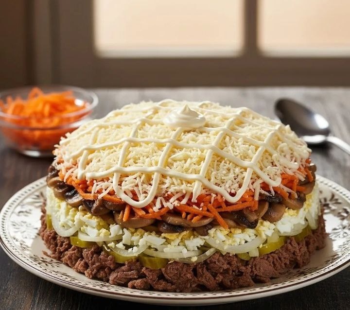 🥗 ⏱20 минут | 280 ккал(100 г) 🛒Что нужно: 🥩Отварная говядина или свинина — 300 г 🍄Маринованные шампиньоны — 200 г 🧀Сыр твердый — 150 г 🥚Яйца вареные — 4 шт. 🥕Морковь по-корейски — 150 г 🧅Лук маринованный — 1 шт. 🥣Майонез жирный — 200 г 👩🍳Как готовить: Нарежьте мясо и грибы небольшими кусочками, яйца и сыр натрите на крупной терке. Выкладывайте салат слоями, щедро промазывая каждый слой майонезом: мясо, затем маринованный лук, следом грибы, яйца и морковь по-корейски. Верхний слой густо засыпьте тертым сыром и сделайте нарядную сеточку из майонеза. Дайте салату настояться в холоде пару часов перед подачей.