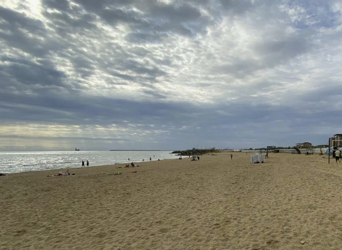 Берег тут прямой, как будто линейкой прочерчен, нет бухт, нет укромных уголков, просто линия и всё. Песок серо-жёлтый, рыхлый, и местами с какими-то вкраплениями, похожими на пыль от ракушек. У воды песок проваливается под ногами, и когда стоишь, то такое чувство, будто пол уходт, это, кстати, непривычно, особенно если раньше в основном купались на Азовском.