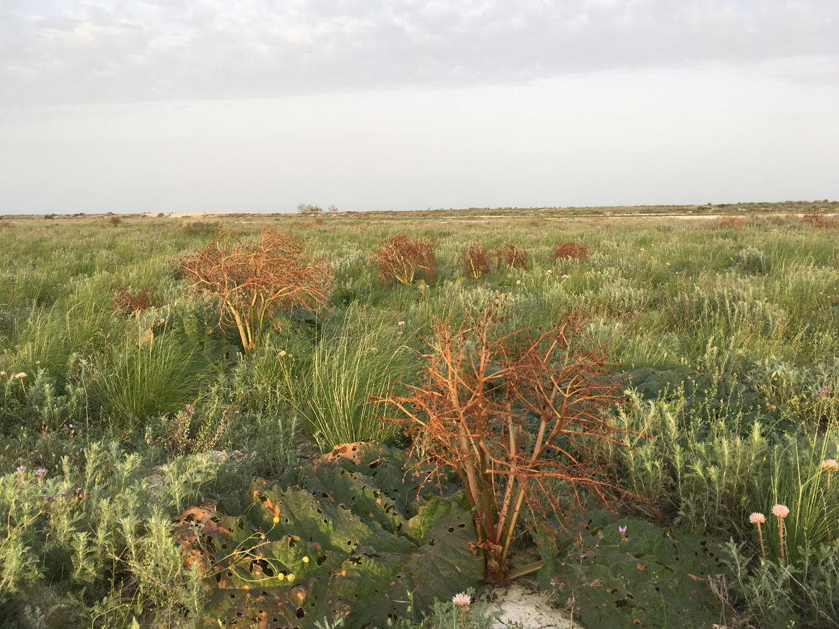 Это ода восхищения по Rheum tataricum.. Rheum tataricum - многолетние растение, семейства Гречишные (Polygonaceae). Несколько лет назад, когда впервые собиралась в Казахстан, очень хотелось увидеть степь во всей красе. После Уральских гор.. степь - это бесконечный простор! В общем, совсем другое.. Однако, тогда я не представляла насколько они бывают разные.. более того, уж точно степь у меня тогда не ассоциировались никак с полынью. И далее вроде как уже не совсем степи, а опустыненные степи.. Тогда впервые я увидела это растение из окна автобуса. Вот только ближе познакомиться с Rheum tataricum у меня получилось во вторую поездку в Казахстан.. совсем в другом направлении: по пути и в Мангистау. Согласитесь, эти растения очень сильно притягивают взгляд.. Он так и фокусируется на мощных листьях. Настольно он сильно контрастирует на фоне всей остальной растительности!!! Конечно, к нему хочется подбежать.. посмотреть.. сфотографировать.. А вот желания потрогать его шикарные листья у мен