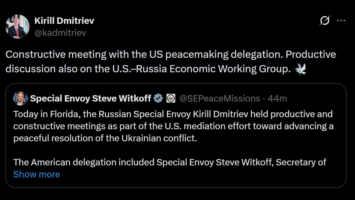 Спецпредставитель президента России Кирилл Дмитриев охарактеризовал прошедшие в Майами переговоры с американской стороной как