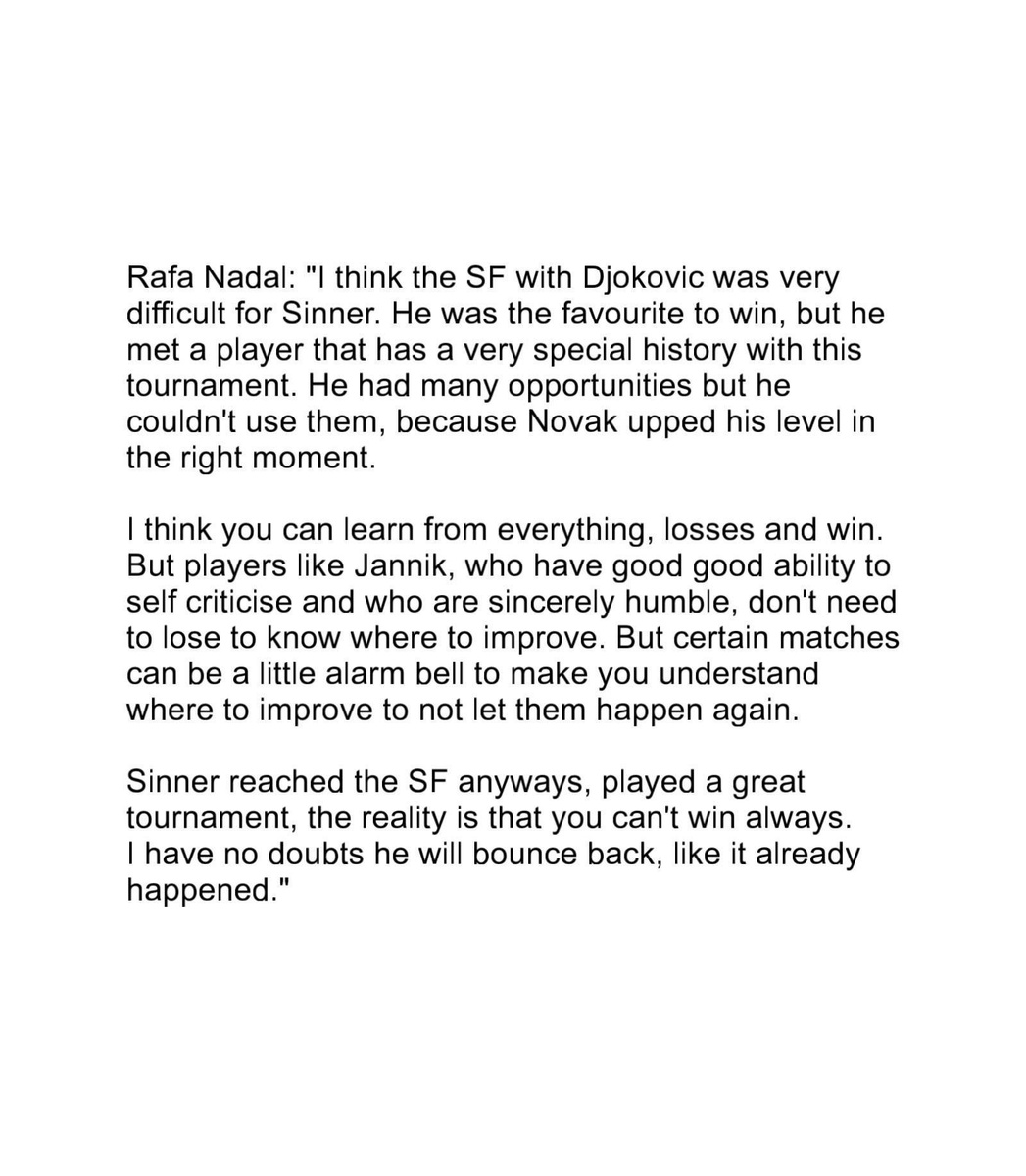 Рафа Надаль о поражении Янника Синнера в полуфинале Australian Open 2026 против Новака Джоковича