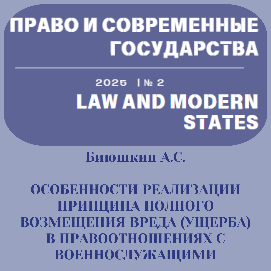 Представляем публикации 2 номера 2025 года Журнала «Право и современные государства» ОСОБЕННОСТИ РЕАЛИЗАЦИИ ПРИНЦИПА ПОЛНОГО ВОЗМЕЩЕНИЯ ВРЕДА (УЩЕРБА) В ПРАВООТНОШЕНИЯХ С ВОЕННОСЛУЖАЩИМИ. Биюшкин Александр Станиславович, аспирант, преподаватель Уральский государственный аграрный университет, email: a.s.biiyuskin@gmail.com. УДК340.13 ННС5.1.1. Аннотация:Принцип полного возмещения вреда является ключевым элементом государственной политики Российской Федерации в области социальной защиты военнослужащих, сотрудников Росгвардии, добровольцев Министерства обороны РФ и членов их семей. В данной статье анализируется нормативно-правовая база, связанная с применением этого принципа. Отмечается, что в России создана эффективная система реализации принципа полного возмещения вреда, охватывающая как реальный, так и потенциальный ущерб. Однако выявлены пробелы в регулировании компенсации морального вреда, что ограничивает абсолютное выполнение данного принципа. Для устранения коллизий между общими