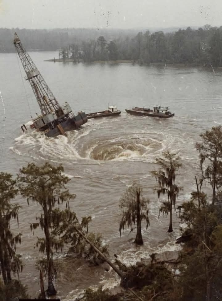 Вот это я понимаю — бдыщ. В 1980 году ошибка в расчётах превратила тихое озеро Пенёр в Луизиане в апокалиптическую воронку. Всё началось с того, что нефтяники из Texaco, опираясь на неверные координаты, начали бурить рядом с озером. Их бур неожиданно пробил потолок соляной шахты «Алмазный кристалл», находившейся на глубине 400 метров прямо под дном озера. Пресная вода устремилась в шахту, быстро растворяя соль. Отверстие стало лавинообразно расширяться. Разворачивалась цепь невероятных событий: На поверхности: за несколько минут в разверзнувшуюся дыру была проглочена вся буровая установка (высотой с 15-этажный дом), 11 барж, доки и гектары земли с домами и деревьями. Под землёй: в шахте, где работали более 50 человек, начался сильный ветер от потока воздуха, а затем хлынула вода. Благодаря слаженным действиям и героизму оператора лифта все шахтёры были эвакуированы буквально за минуты до прибытия потока. Изменение географии: течение соединяющей озеро с океаном реки развернулось всп