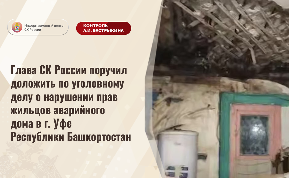 Глава СК России поручил доложить по уголовному делу о нарушении прав жильцов аварийного дома в г. Уфе Республики Башкортостан В СМИ сообщается о нарушении жилищных прав семьи с пятью детьми, двое из которых являются инвалидами, в городе Уфе Республики Башкортостан. Здание барачного типа на улице Загорской 1951 года постройки находится в непригодном для проживания состоянии: инженерные коммуникации изношены, стены промерзают, в результате чего температурный режим в жилых помещениях не соответствует установленным нормам. Указанное приводит к возникновению заболеваний у несовершеннолетних. Кроме того, в помещении санузла произошло обрушение потолочных перекрытий. Несмотря на признание в 2021 году строения аварийным, до настоящего времени гражданам благоустроенное жилье не предоставлено. Вместе с тем многодетная семья с 2011 года состоит на учете лиц, нуждающихся в улучшении жилищных условий, однако мер к реализации их прав также не принимается. Многочисленные обращения в компетентные орг