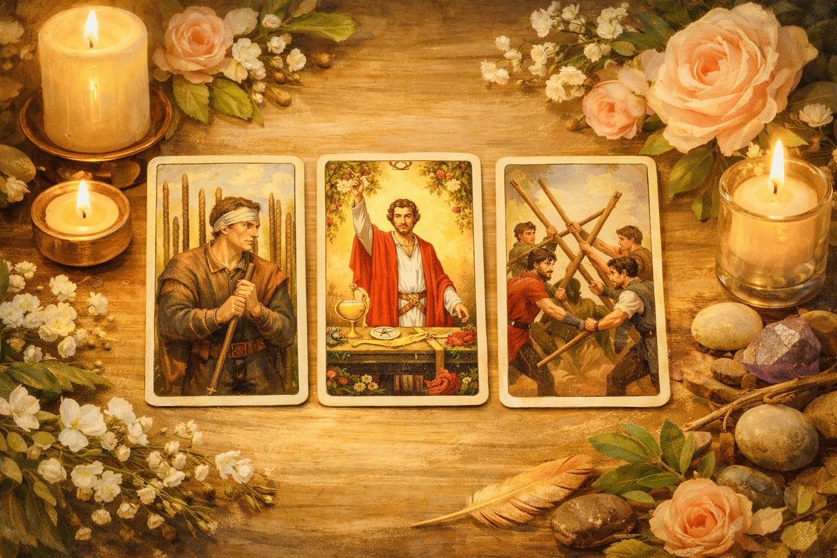 Карты намекают, что выход из круга «борьбы и обороны» лежит через признание усталости. Пока вы (9 жезлов) держите оборону, а он (Маг) пытается всё контролировать, вы заперты в 5 жезлов (конфликте).