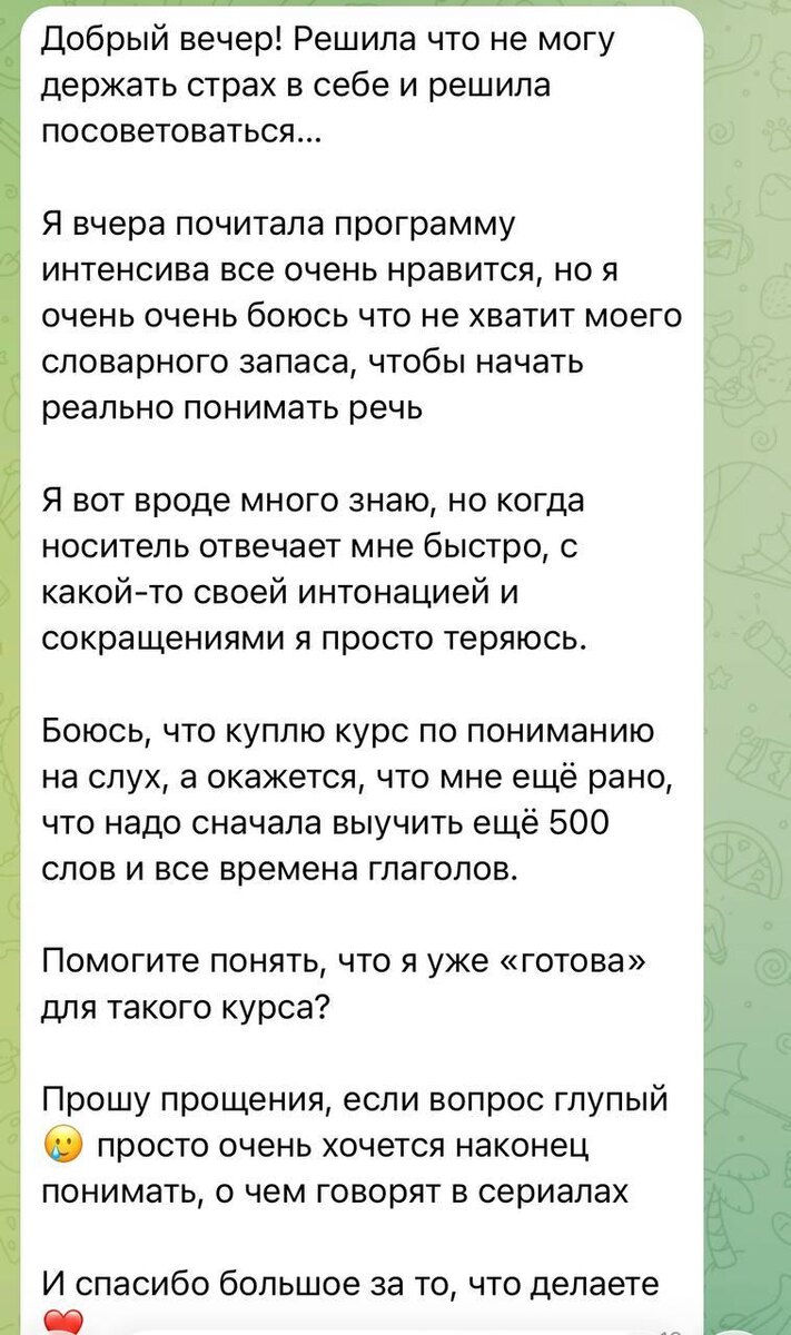 ?» Сегодня хочу разобрать этот страх не только как преподаватель, но и с точки зрения того, как работает наш мозг. Научный факт: наш мозг учится распознавать речь не через словарь, а через паттерны (узнаваемые шаблоны звуков). Даже при небольшом словарном запасе мы способны «цепляться» за знакомые элементы в потоке речи: интонацию, ритм, частотные сочетания звуков. Именно на этом построен метод 3-х скоростей в интенсиве: 1. Медленная скорость — мозг спокойно узнаёт каждое слово. 2. Естественная скорость — учится связывать слова в поток, отсекая лишнее. 3. Ускоренная версия (с особенностями речи носителей: словами паразитами и т.п.) — тренирует мгновенное распознавание даже в быстрой речи. Все это направлено на развитие нейропластичности: мозг адаптируется к темпу, если давать ему постепенную нагрузку. И отвечаю на главный вопрос: Интенсив будет полезен даже если у вас уже есть начальная база (пусть и небольшая). Все аудио построены так, чтобы вы могли расслышать и понять уже извес