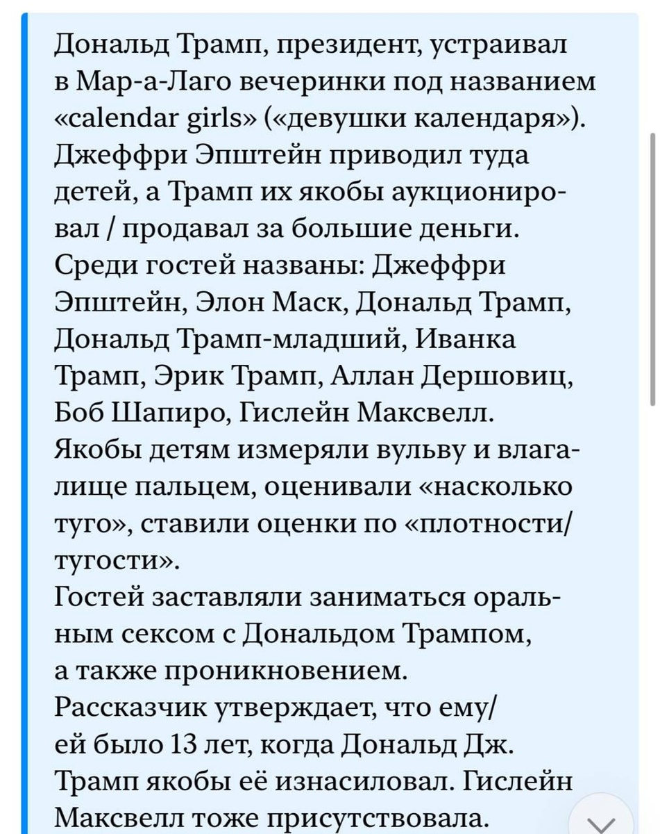 Согласно анонимным свидетельствам, президент США якобы продавал несовершеннолетних девушек на аукционах на своем острове в Мар-а-Лаго и принимал участие в их растлении. Обвинения включают случай изнасилования 13-летней девочки, а также предполагаемое использование поля для гольфа в Калифорнии для подобных действий. Некоторые из девушек, по слухам, бесследно исчезли, и существует версия, что они могли быть убиты и захоронены на территории гольф-клуба. ❗️Министерство юстиции США удалило документ с этими показаниями всего через полтора часа после его публикации. Имя Трампа в них упоминалось более 3 тыс. раз ❗️Кроме того, новые материалы касаются Билла Гейтса, который, как утверждается, пытался скрыть от жены Мелинды, что заразился венерическим заболеванием после встреч с «русскими девушками». В документах говорится, что он просил Эпштейна предоставить антибиотики для Далее читать ниже...