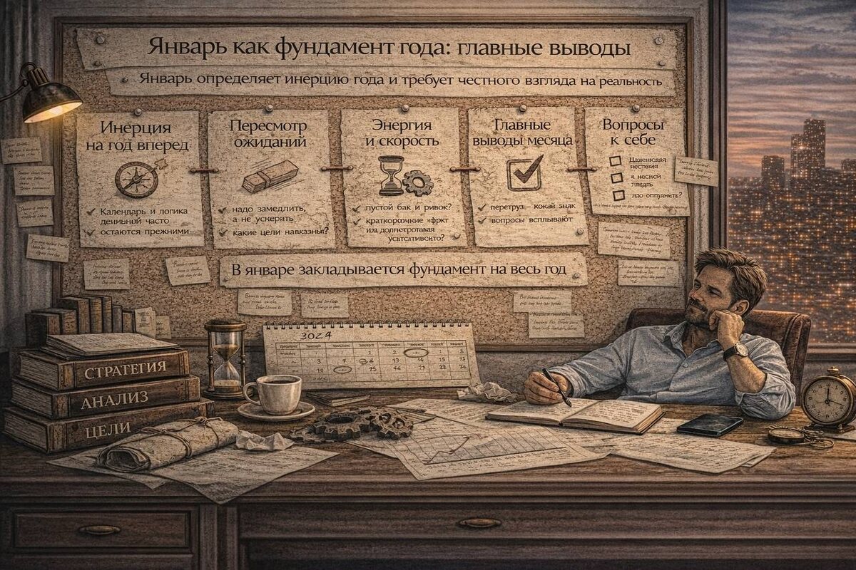 Январь редко бывает по-настоящему продуктивным. Он странный, рваный, противоречивый. Формально — начало нового года, психологически — продолжение старого. Именно поэтому этот месяц важнее, чем кажется: он не про рывок, а про инерцию, с которой бизнес и предприниматель входят в год. 🧩 Почему январь задаёт инерцию года Январь почти никогда не показывает результаты. Зато он очень точно показывает способ движения: как принимаются решения — в спешке или осознанно; что ставится в приоритет — скорость или устойчивость; есть ли у бизнеса направление или только список задач. Инерция, заложенная в январе, потом незаметно тянется месяцами. Меняется календарь, но не меняется логика действий. ⚠️ Типичные ошибки первого месяца Самые частые ловушки января выглядят так: попытка «начать год с максимума», не закрыв прошлое; перегруз задачами без понимания, что действительно важно; ожидание быстрого эффекта там, где нужны системные шаги; давление на себя за «недостаточную продуктивность». Январь