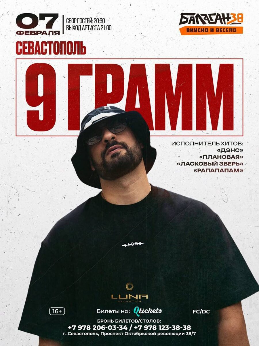🎵 Сходим на незабываемый концерт - 9 ГРАММ Приходите с друзьями и готовьтесь к вечеру, который станет настоящим праздником музыки! Не упустите шанс стать частью этого яркого события! 👉 Когда? 7 февраля в 21:00 👉 Где? @balagan.38 , Проспект Октябрьской революции 38/7 👉 Билеты уже в продаже: +7(978)206-03-34, сбор гостей в 20:40 ✨Давай сходим, Севастополь | Читайте и смотрите нас в МАХ