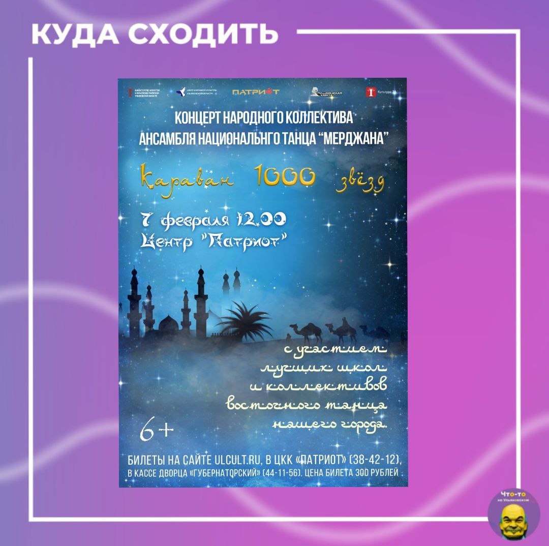 "✨ Необычный формат концерта с участием множества танцевальных коллективов порадует зрителей разнообразными постановками, новыми идеями, возможностью увидеть самых разных по характеру и стилю артистов на одной сцене. Яркие восточные красавицы, волшебные наряды и чарующие ритмы не оставят равнодушными ни одного зрителя! 📅Когда: 7 февраля в 12:00 📍Где: ЦКК "Патриот" (пр. 50-летия ВЛКСМ, 15) #куда_пойти_ул
