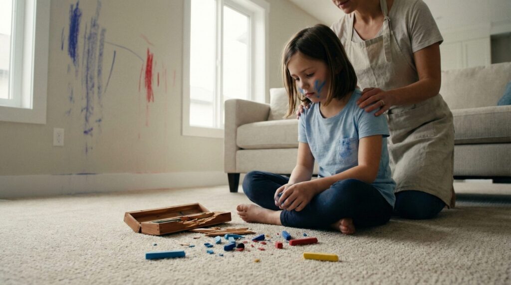 Юля стояла напротив, закрыв лицо руками. Тёма потянулся к последнему уцелевшему мелку — золотистому. Юля рванулась и толкнула его в плечо. Мальчишка не удержался, зацепился за ковер и сел на пол. Секунда тишины — и комнату заполнил ор. — А-а-а-а! Она меня ударила! Баба-а-а!