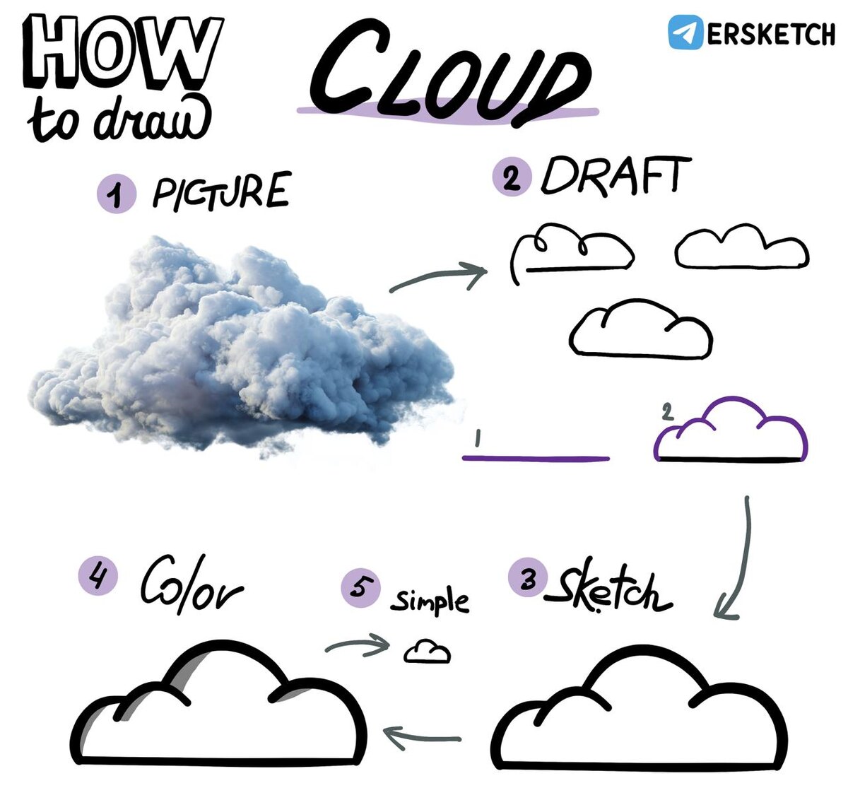 Облако плоское снизу и пушистое сверху. Его довольно просто нарисовать — всего в два шага.