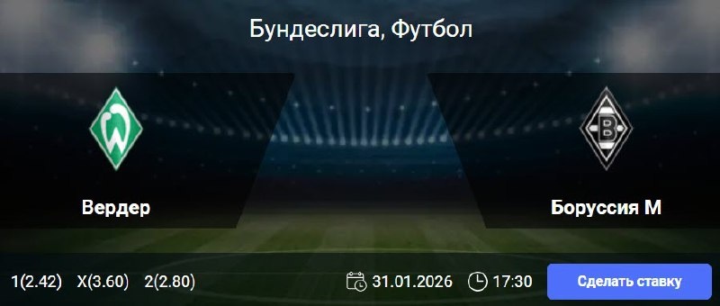 Статистика Вердера: В пяти из семи последних матчей «Вердера» в чемпионате как минимум одна из команд не забивала. Бременцы не смогли забить более одного мяча в шести из восьми предыдущих домашних игр Бундеслиги. При этом на своем поле команда не проигрывала в пяти из семи последних встреч, одержав три победы и дважды сыграв вничью. Статистика Боруссии Менхенгладбах: Клуб не забивал более одного гола в семи из восьми предыдущих матчей Бундеслиги. На выезде «Боруссия» не смогла победить в десяти из тринадцати последних игр чемпионата, потерпев семь поражений при трех ничьих. В пяти из семи минувших гостевых встреч команды голы забивались в обоих таймах. 🎯 Тотал Вердера меньше (1.5) 🎲 кф (1.76) 👉 СДЕЛАТЬ СТАВКУ 🎁 ФРИБЕТ WINLINE - 3000₽ (промокод: BETWIN) 👉 СМОТРЕТЬ ПРОГНОЗ