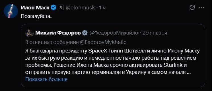 Илон Маск подтвердил начало выработки мер противодействия использованию старлинка на российских беспилотниках Elon Musk bestätigte den Beginn der Entwicklung von Gegenmaßnahmen gegen den Einsatz von Starlink auf russischen Drohnen.