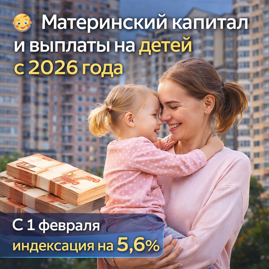 Основание — проект постановления правительства РФ «Об утверждении коэффициента индексации выплат, пособий и компенсаций в 2026 году». Документ пока не утверждён окончательно, но резких изменений не ожидается. Я собрал для вас ключевые цифры, которые напрямую влияют на семейный бюджет и возможности покупки недвижимости 🔽 🟣 Материнский капитал (с учётом индексации) С 1 февраля 2026 года размер составит: ▪️ На первого ребёнка — 728 921,90 ₽ ▪️ На второго и последующих детей (если не получали на первого) — 963 243,17 ₽ ▪️ На второго ребёнка (если маткапитал на первого уже получен) — 234 321,27 ₽ ❗️❗️❗️Важно: Маткапитал индексируется не только для тех, кто родит в 2026 году. Если сертификат был получен ранее и не использован полностью, проиндексируют оставшуюся сумму. 📌 Единовременное пособие при рождении ребёнка С 1 февраля: 28 450,45 ₽ на каждого ребёнка. Если один из родителей работает — выплата оформляется через работодателя, если оба не работают — через Социальный фонд. Материнский