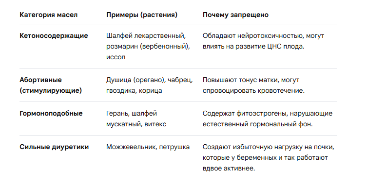 - Тератогенный эффект: ряд масел (например, шалфей мускатный, полынь, рута) содержит кетоны, которые в высоких концентрациях могут влиять на развитие плода.