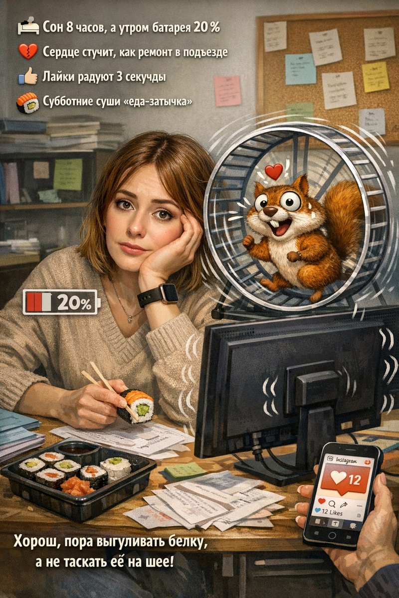 Лена, 29 лет, маркетолог в онлайн-школе. Внутри неё живёт «белка-стрессокрутка»: в стрессовые дни грызун садится на колесо и крутит его так, что монитор вибрирует.