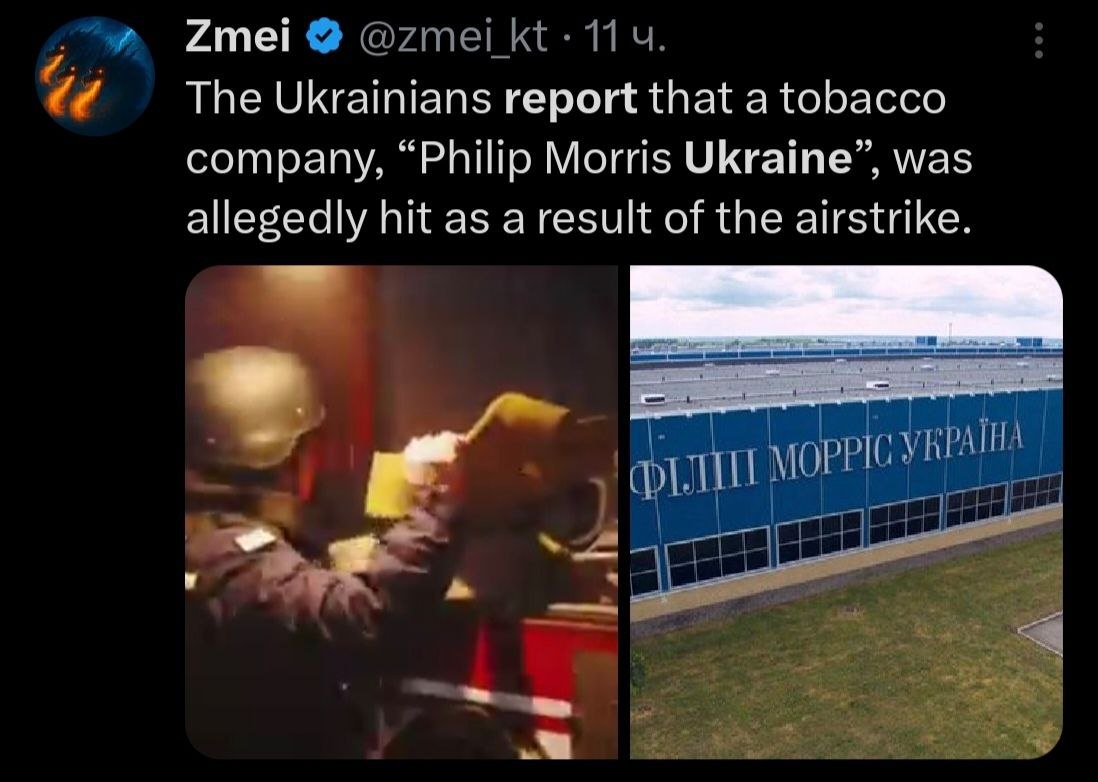 Несколькими днями ранее обвинение в крупной и многолетней контрабанде сигарет получил глава украинских пограничников Несколькими днями ранее его отправил в отставку Зеленский (который конечно же знал, о готовяшихся арестах) 🔹Киевская хунта всегда зарабатывала на левой торговле сигаретами. А сейчас в годину расследований легко могла подчистить следы своих преступлений инсцинировав удар по табачной фабрике Блокнот пропагандиста