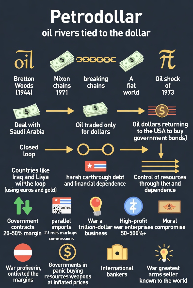 🌟 PETRODOLLAR: НЕФТЯНЫЕ РЕКИ, ПРИКОВАННЫЕ К ДОЛЛАРУ Бреттон-Вудс (1944) приковал доллар к золоту. Но в 1971 Никсон разорвал эти цепи. Мир стал фиатным. Затем — нефтяной шок 1973 года. Ответ США? Гениальная сделка с Саудовской Аравией: нефть — только за доллары. Так родился Petrodollar. Нефтедоллары возвращались в США, покупая гособлигации. Круг замыкался. Тех, кто пытался его разорвать (Ирак — на евро, Ливия — на золото), ждала жестокая расплата. Механизм: Это контроль ресурсов без прямых колоний — через долги, «помощь», невидимые нити финансовой зависимости. 💼 ЗАРАБОТОК НА ВОЙНЕ: ОТ ГОСОБОРОНЗАКАЗОВ ДО ТЕНЕВЫХ СПЕКУЛЯЦИЙ Госконтракты: Маржа 20–50% — это норма (еда: 1,6 млрд$ для Aramark). Малый бизнес довольствуется крохами, но и они сладки. Параллельный импорт: Санкции? Прекрасно! Наценка в 2–3 раза (люкс из Турции; расчёты в крипте). Комиссия в 30%, обороты — миллионы. Заключение: Война — это бизнес. Триллионный. Мораль здесь — роскошь, которую не могут себе позволить те, кто прод