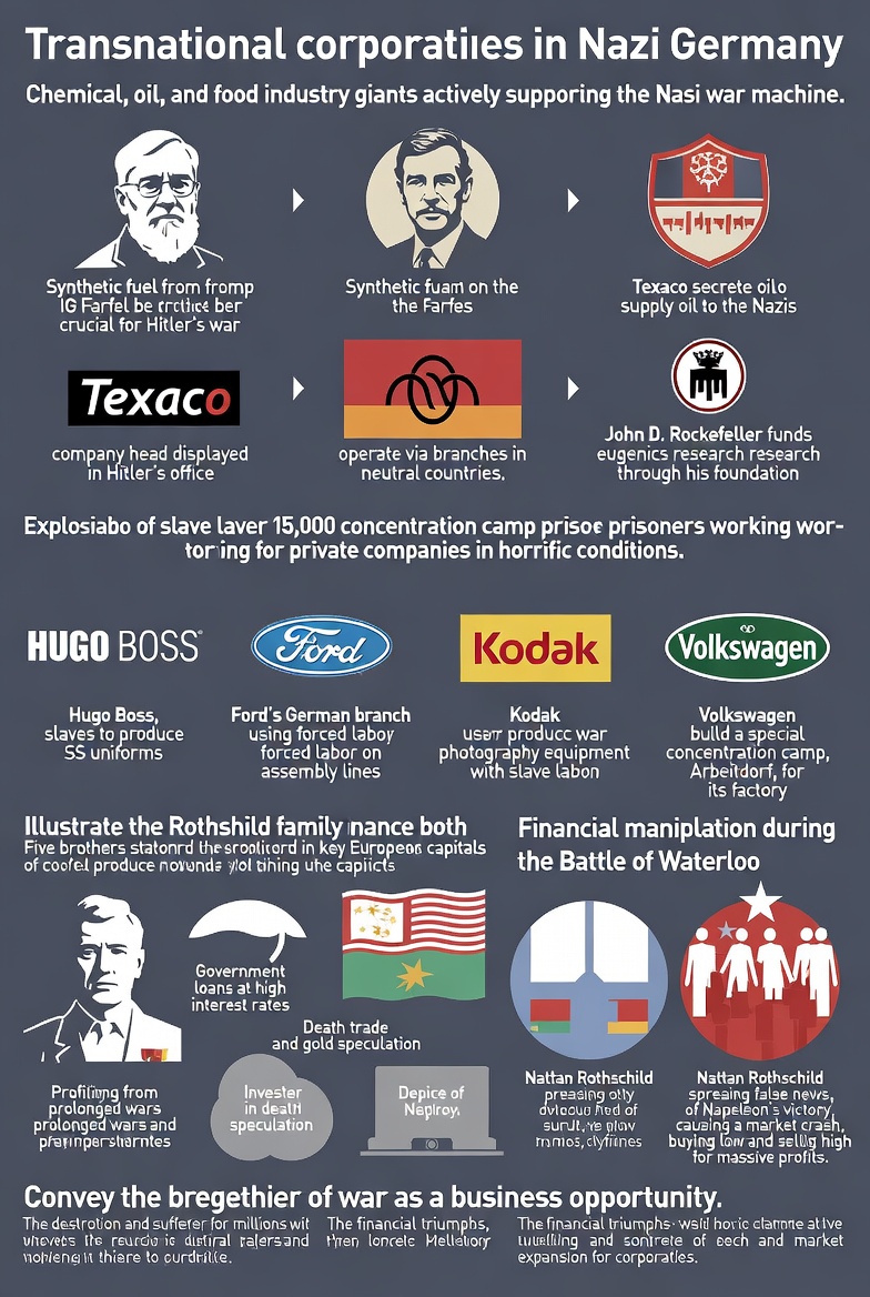 🌟 УЧАСТИЕ ТРАНСНАЦИОНАЛЬНЫХ КОРПОРАЦИЙ В НАЦИСТСКОЙ ГЕРМАНИИ Транснациональные гиганты — химические, нефтяные, пищевые — активно кормили машину нацизма. Министр вооружений Альберт Шпеер признавал: синтетическое топливо от IG Farben было ключом к войне Гитлера. Портрет главы компании висел в кабинете фюрера… Председатель Texaco тайно поставлял нефть нацистам, а Джон Д. Рокфеллер через свой Фонд финансировал их чудовищные исследования в области евгеники. Они работали через филиалы в нейтральных странах, демонстрируя миру ужасающий принцип: мораль — переменная, прибыль — константа. ⛓️ ЭКСПЛУАТАЦИЯ РАБСКОГО ТРУДА: ТЁМНОЕ СЕРДЦЕ ВОЕННОГО ПРОИЗВОДСТВА В 1942 году нацисты создали крупнейшую в истории армию рабов — более 15 000 человек из концлагерей работали на частные компании. Это был адский конвейер, где человеческая жизнь не стоила ничего. Hugo Boss: Рабы шили элегантную униформу для СС. Невыполнение нормы грозило возвращением в лагерь. Ford (немецкий филиал): Конвейеры крутились руками