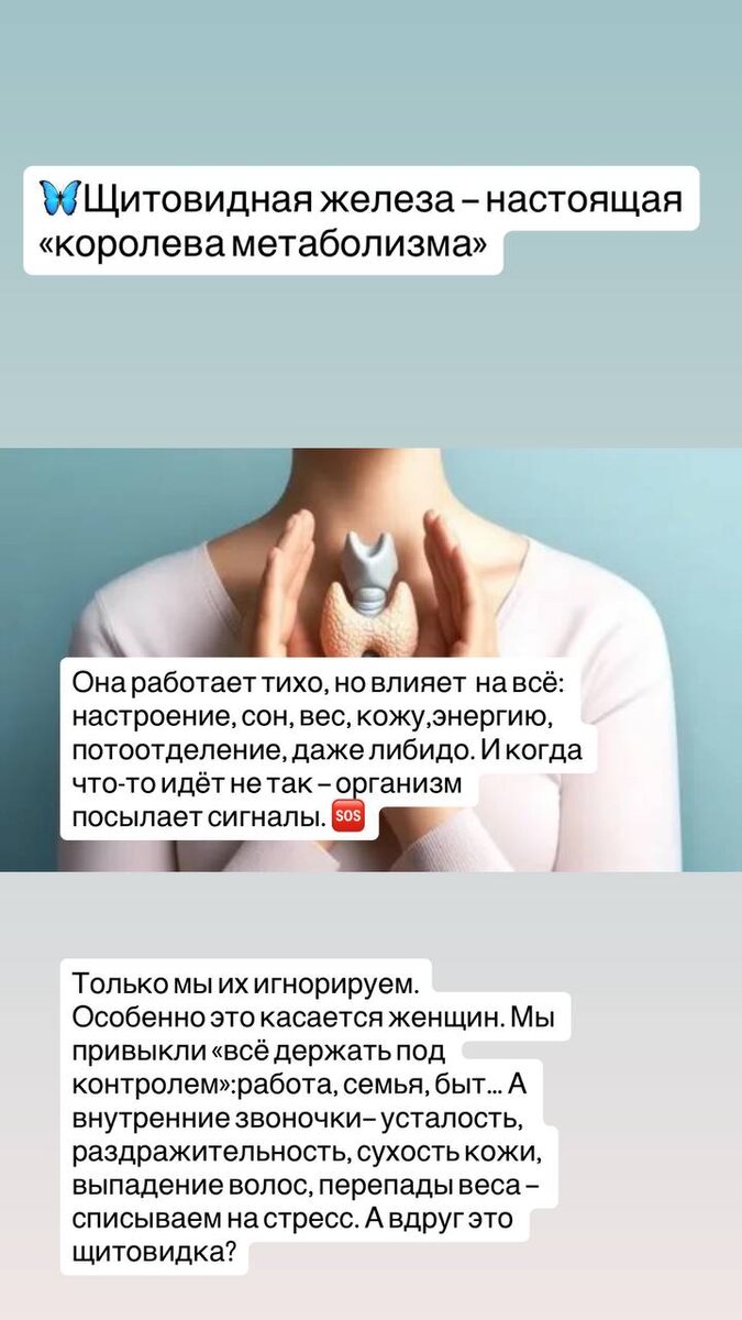 ❓ 🦋Щитовидная железа — «королева метаболизма». Она тонко регулирует настроение, вес, кожу, энергию, сон и даже либидо. И когда в ней сбой — тело подаёт сигналы. Часто мы их игнорируем. Женщины склонны списывать это на стресс, но за этим может стоять щитовидка. Она — часть гормональной цепочки: гипоталамус → гипофиз → щитовидная железа → надпочечники → половые органы Сбой в одном звене — влияет на всю систему. Что проверить❓ Анализы: ✔️ТТГ, свободный Т3 и Т4 — функция железы ✔️Антитела к ТПО и ТГ — исключение аутоиммунного процесса ✔️УЗИ щитовидной железы — структура: узлы, увеличение, изменения Повышенные антитела — не приговор. Это сигнал: пора разобраться. Аутоиммунный процесс можно замедлить или остановить, если вовремя работать с причинами • хронический стресс • питание • состояние кишечника • дефицит витаминов (йод, селен, витамин D, железо) Завтра — расскажу, как отличить гипотиреоз от гипертиреоза по симптомам.