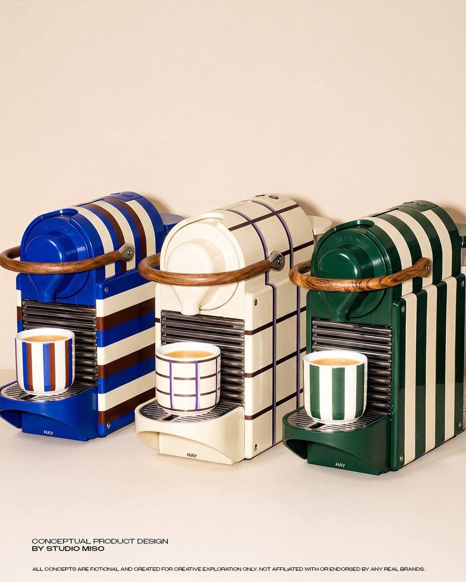 ? ☕️ Концептуальные решения как путь к успеху дизайнера Создание концептуального дизайна для коллабораций известных брендов помогает дизайнерам заявить о себе. Удачные визуализации привлекают внимание руководства компаний и мировых лидеров мнений, повышая шансы на дальнейшее сотрудничество. Например, студия Studio Miso разработала успешную коллекцию визуализаций для совместной линейки продуктов Nespresso и Hay, включающую уникальные кофемашины и посуду. Поэтому дизайнерам важно регулярно демонстрировать свои креативные концепции, даже если они были созданы вне реальных заказов («проекты в стол»). Такие публикации повышают узнаваемость и помогают выделиться среди конкурентов, показывая клиентам уникальный стиль и видение специалиста. Современные инструменты искусственного интеллекта значительно облегчают процесс разработки концептов, позволяя экономить силы и время.