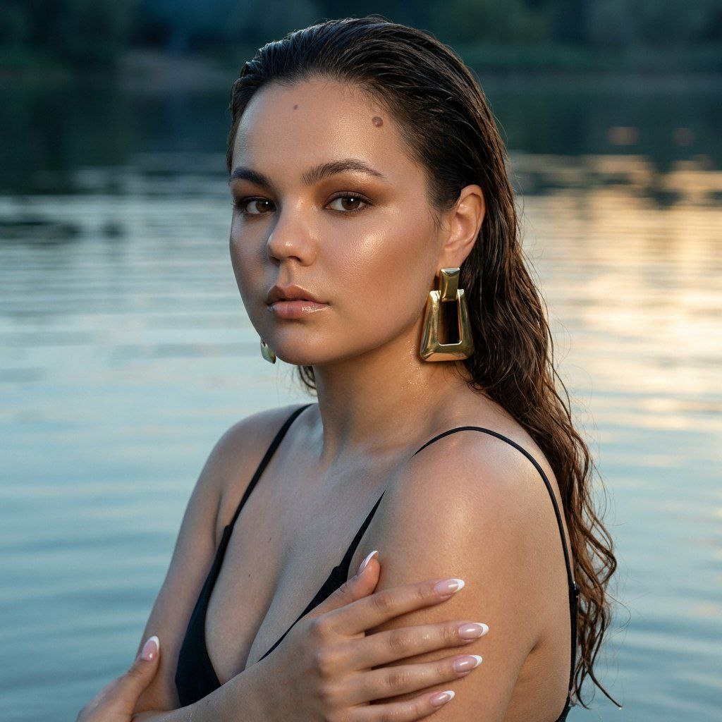 😀Выбираем "нейросети" 😀Нажимаем "Nano Banana" 😀Нажимаем "Nano Banana Pro" 😀Прикрепляем через скрепку свое фото и выбранный промпт 😀Наслаждаемся результатом😍 Создай фото не меняя черты лица и цвет волос. • Образ и настроение: утончённый, мокрый «wet-look» на рассвете/закате у тихого зеркального озера; мягкий прохладный свет, приглушённые синие и серо-зелёные тона с тёплыми акцентами золота. • Прическа: длинные тёмно‑каштановые волосы, полностью влажные и зачесанные назад, струящиеся по спине, с лёгкой естественной волной у концов; волосы аккуратно заправлены за одно ухо, чтобы подчеркнуть серьгу; мокрый блеск, видно отдельные пряди, сохраняющие текстуру воды. • Макияж: – Кожа: тон выровнен лёгкой, полупрозрачной «glowy» базой — минимальная матовость, выраженный влажный хайлайт на верхней части скул, по переносью носа и на купидоновом луке; натуральный, слегка загорелый/тёплый тон. – Скулы: нежный тёплый бронзер по контуру и лёгкий персиково‑розовый румянец, растушёванный для