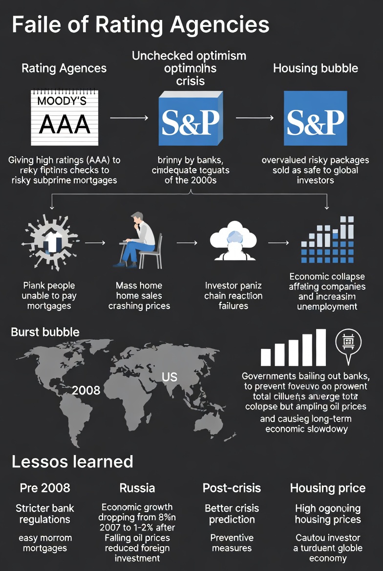 ⚠️ ПРОВАЛЕНЫЕ РЕЙТИНГОВЫЕ АГЕНТСТВА: ЗАВЫШЕННЫЕ ОЦЕНКИ И КОРРУПЦИЯ Рейтинговые агентства (например, Moody's, S&P) давно оценивали надёжность ценных бумаг, и всем доверяли, но в кризис они работали нечестно: раздавали субпрайм-ипотекам высшие рейтинги (AAA), игнорируя реальные риски. Причины: прямой подкуп банками, недостаточная проверка бумаг, надежда на лучшее и безудержный оптимизм 2000-х — вера в светлое будущее сыграла роль. Связь с пузырём: Завышенные рейтинги позволяли продавать рискованные пакеты как "надёжные", привлекая инвесторов со всего мира, что усиливало пузырь. Предупреждение: Агентства не замечали реальной ситуации на рынке, несмотря на взятки и ожидания аналитиков о высокой доходности — никто не хотел верить в крах. 💥 ЛОПНУВШИЙ ПУЗЫРЬ: НЕВЫПЛАТЫ, ПАДЕНИЕ ЦЕН И ЦЕПНАЯ РЕАКЦИЯ К 2007–2008 годам люди без доходов не смогли платить ипотеки: они продавали подорожавшие дома, но массовые продажи обрушили цены — теперь даже продажа не покрывала долг. Рынок жилья рухнул, инвест