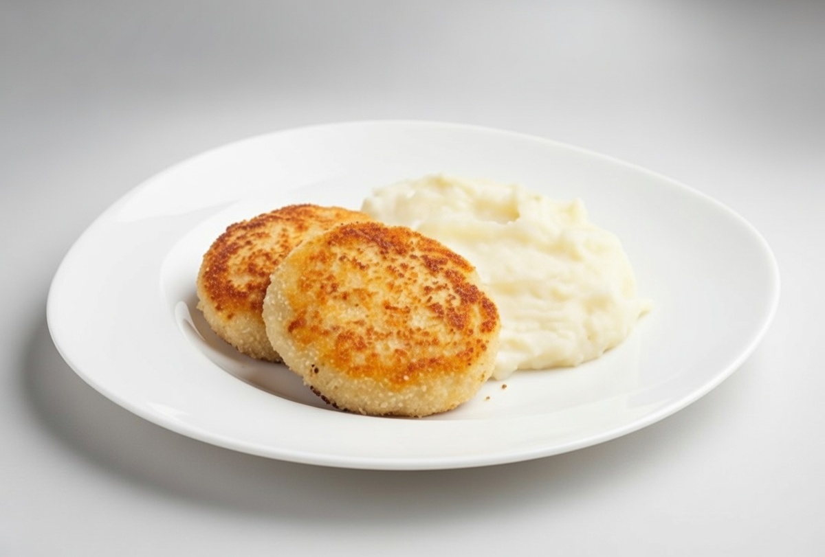 Выкладывайте на тарелку горку пюре, сверху — румяный, ароматный биточек. Можно добавить веточку укропа или ломтик лимона.
