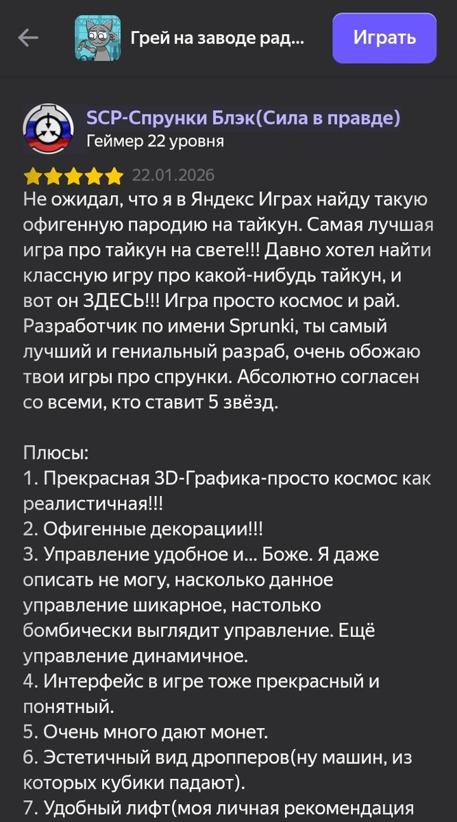 На днях я искал на ЯИ игры, под которыми можно написать отзыв, и вот мне попадается игра "Грей на заводе ради Венды". Я посмотрел картинки игры, и это оказался tycoon. Перед тем как сыграть я посмотрел отзывы, и снова наткнулся на Амира🙄