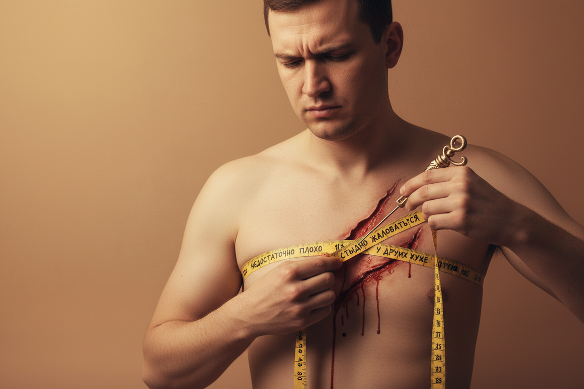 Знакомо? Вы вспоминаете что-то тяжелое из детства или взрослой жизни и сразу же ловите себя на мысли: «Да ладно, не так уж и страшно. Вот у людей настоящие трагедии». Это наша психика пытается защититься. Гораздо проще сказать «ерунда», чем признать: «Да, мне было плохо. Да, это меня ранило». Мы как будто договариваемся с болью: «Я не буду тебя замечать, если ты не будешь слишком уж мешать». Почему мы себя так обманываем? Потому что признать боль страшно. Это значит: Проще сказать «ничего страшного» и жить дальше. Но проблема в том, что непрожитая боль никуда не уходит. Она остается в теле, как ком в горле, как вечно напряженные плечи, как привычка вздрагивать от громких звуков. Она остается в поведении, как неумение говорить «нет», как страх конфликтов, как выбор неподходящих партнеров. Что на самом деле значит «у других хуже»? Это все равно что сказать человеку с переломом руки: «Чего ты ноешь? Вон у того вообще ноги нет!». Да, у кого-то ситуация объективно тяжелее. Но ваша боль это